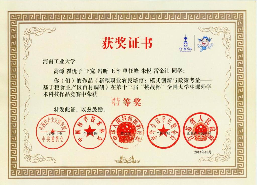 在“挑战杯”全国大学生课外学术科技作品竞赛及“挑战杯”全国大学生创业计划竞赛等方面成绩优异,至今已多次获得特等奖、一等奖、二等奖等奖项,连续多年领跑河南高校。