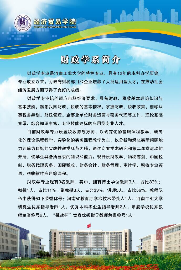 特色课程:纳税筹划、税务代理实务、审计、财务管理、税收软件应用、财务报表分析等。财政学专业实施EIE项目,英语全由外籍教师授课。