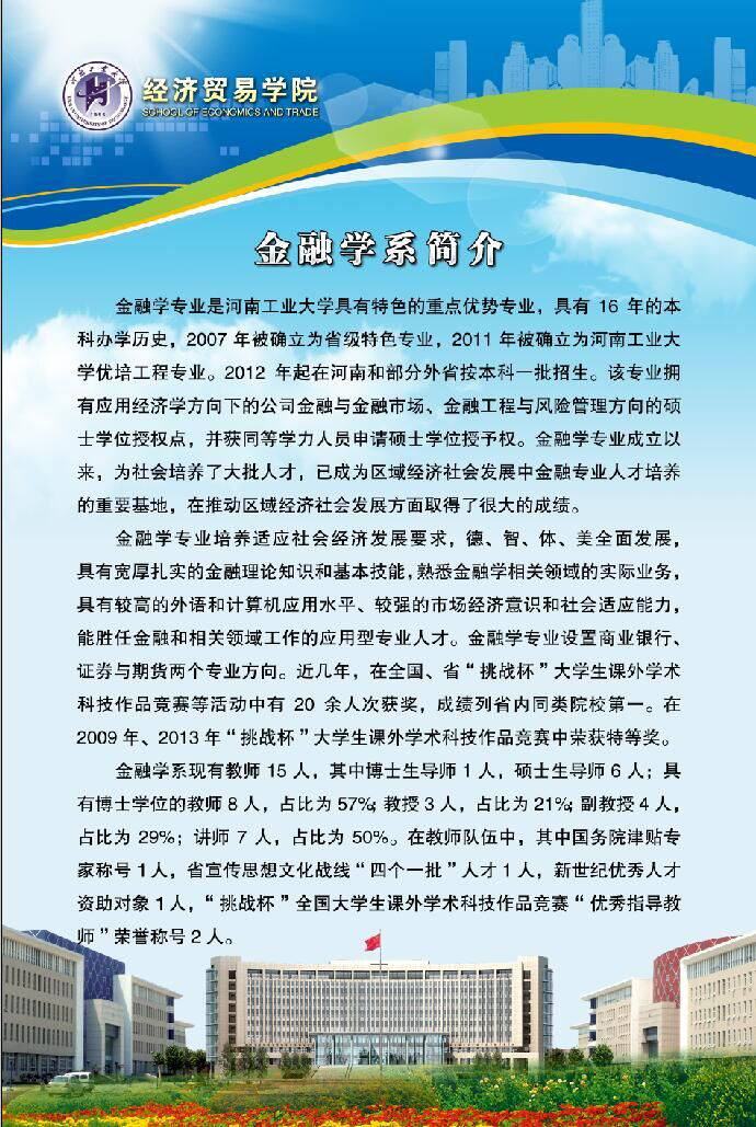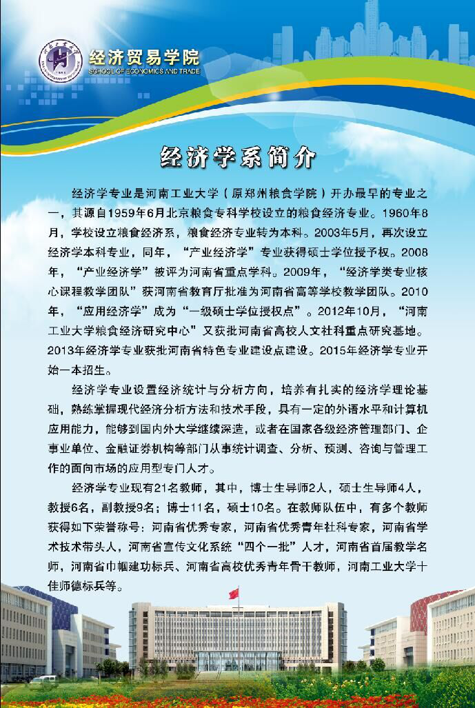 成立于2005年1月19日,由原郑州工程学院经济贸易系和原郑州工业高等专科学校部分教师合并组建而成。虽然创建时间不长,但发展非常快,已建成金融学系、国际经济与贸易系、财政学系、经济学系等4个系,党政办公室、教学办公室、学生工作办公室、团委等4个科室,以及能满足各专业需求的综合实验中心。