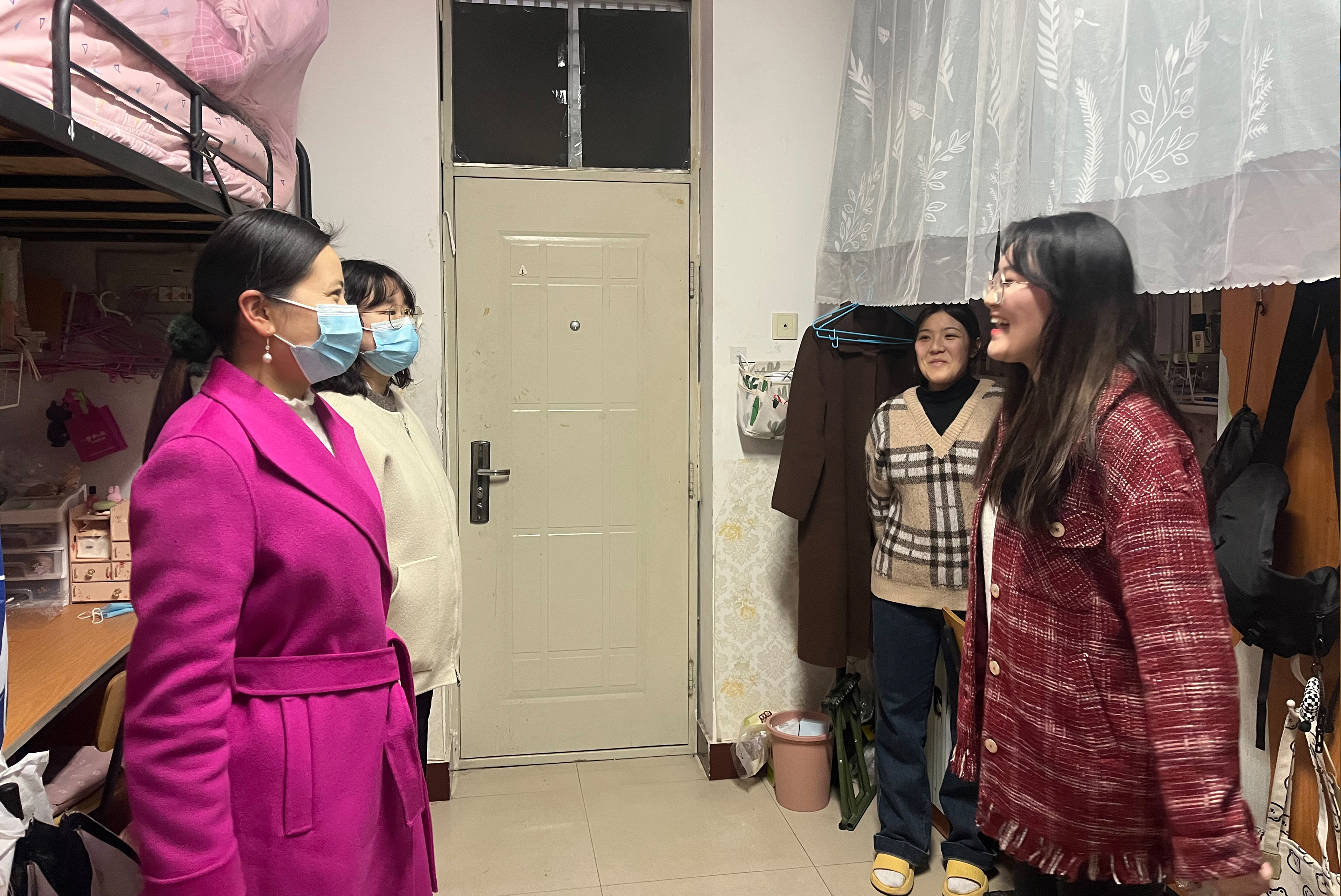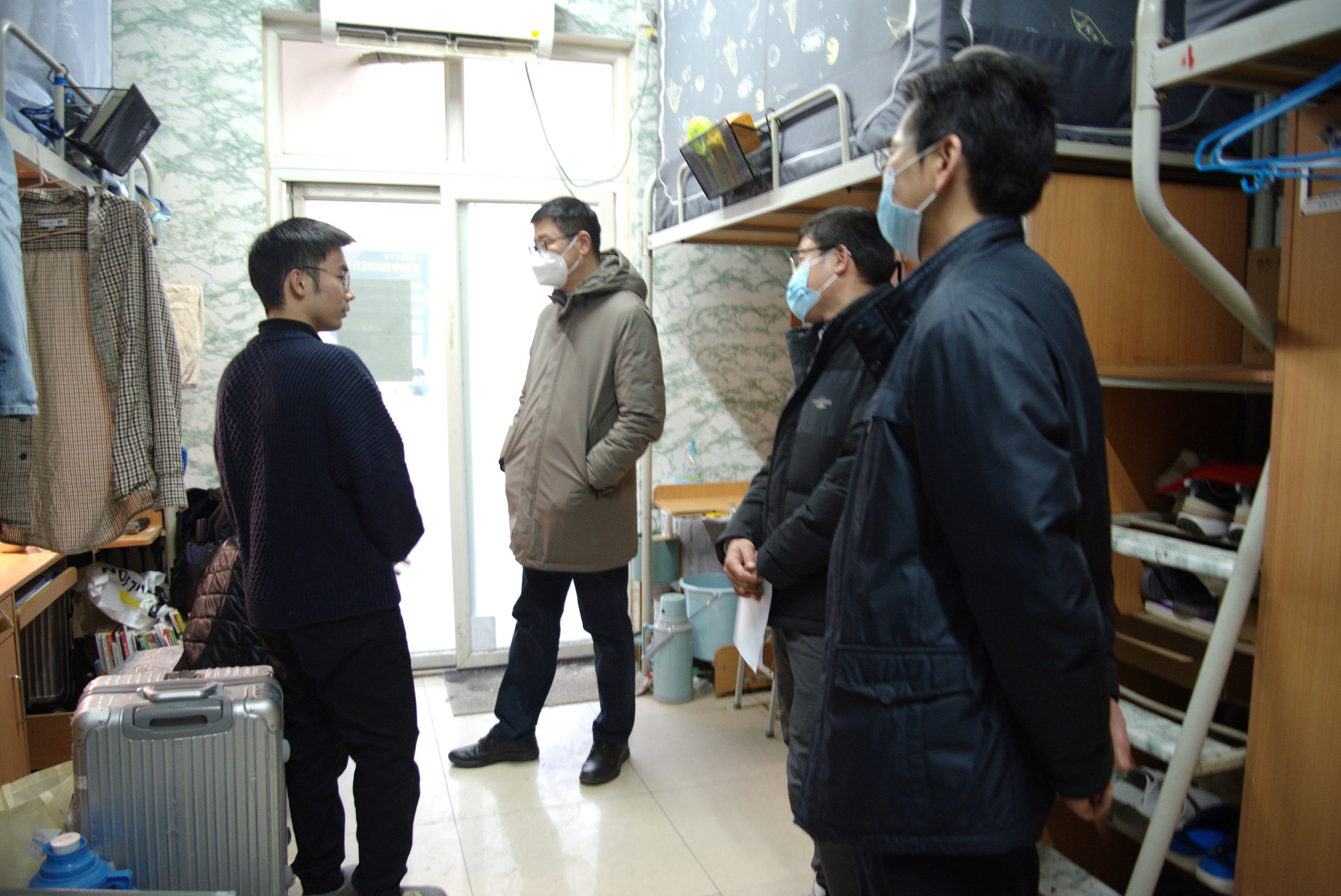 在学生宿舍内,院领导与同学们面对面交流沟通。详细了解学生健康状况、返校后的住宿、学习、就餐等情况,叮嘱同学们注意宿舍卫生和安全、注意防盗、防诈骗,鼓励同学们在新学期要有新目标,要及时调整好状态,以饱满的热情投入到新学期的学习生活中来。当了解到是毕业班宿舍,李刚亲切询问了学生们的未来发展规划、就业、升学等情况,耐心了解学生们生活、就业中存在的困难,给予相关方面的意见建议。同学们对学院领导和老师们的关心表示感谢,并表示一定会养成良好的生活学习习惯,服从学校管理,争取在学业上有新的突破和发展。