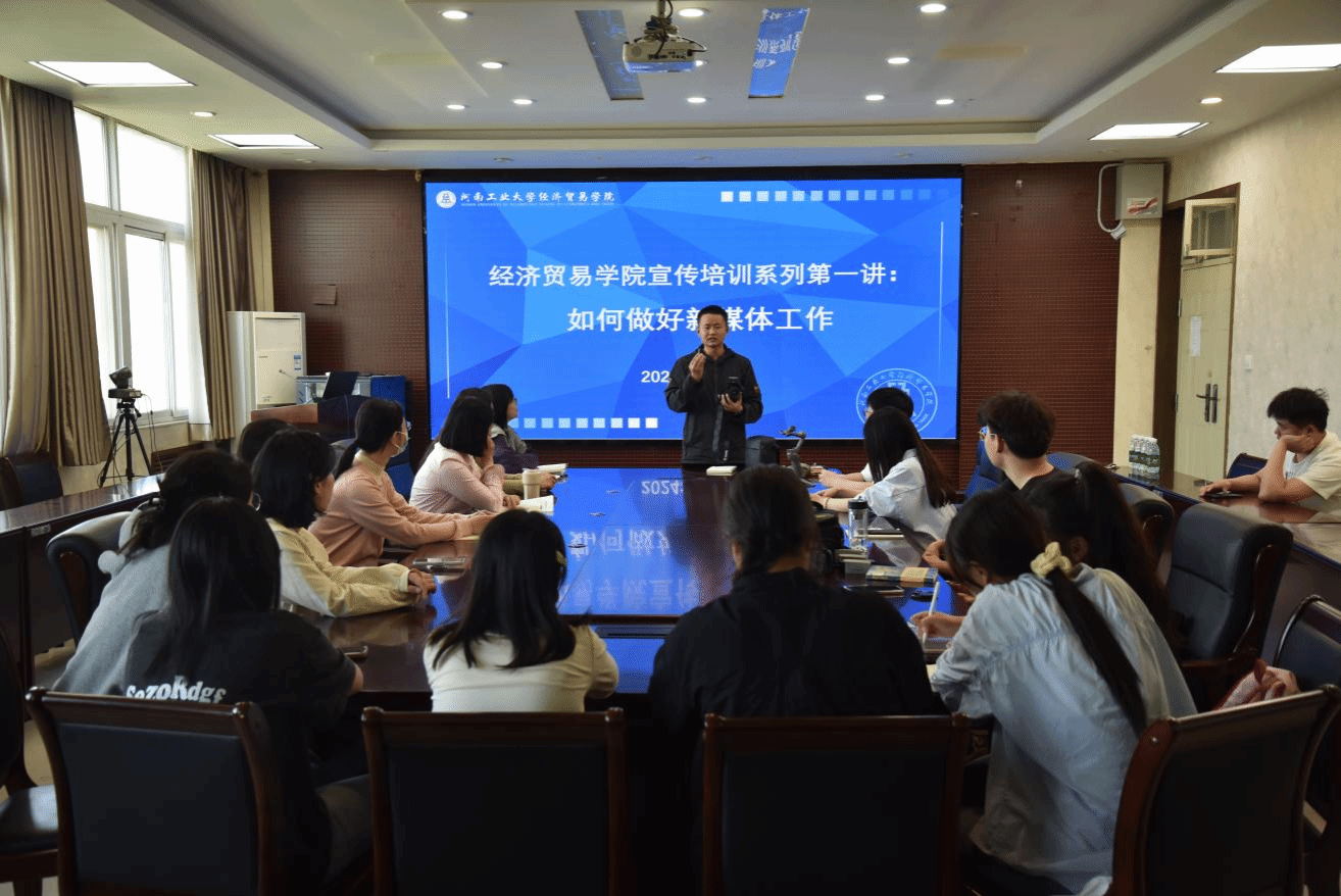 岳鹏珍作总结讲话。她对学院新媒体宣传团队的工作表示肯定,为更好地做好宣传工作,结合学院实际情况提出几点要求:一是提高政治站位,结合校院中心工作去宣传,把好内容质量关;二是加强新媒体队伍建设,激发工作积极性;三是注重经贸文化的传承与创新,做好关键节点的宣传工作。