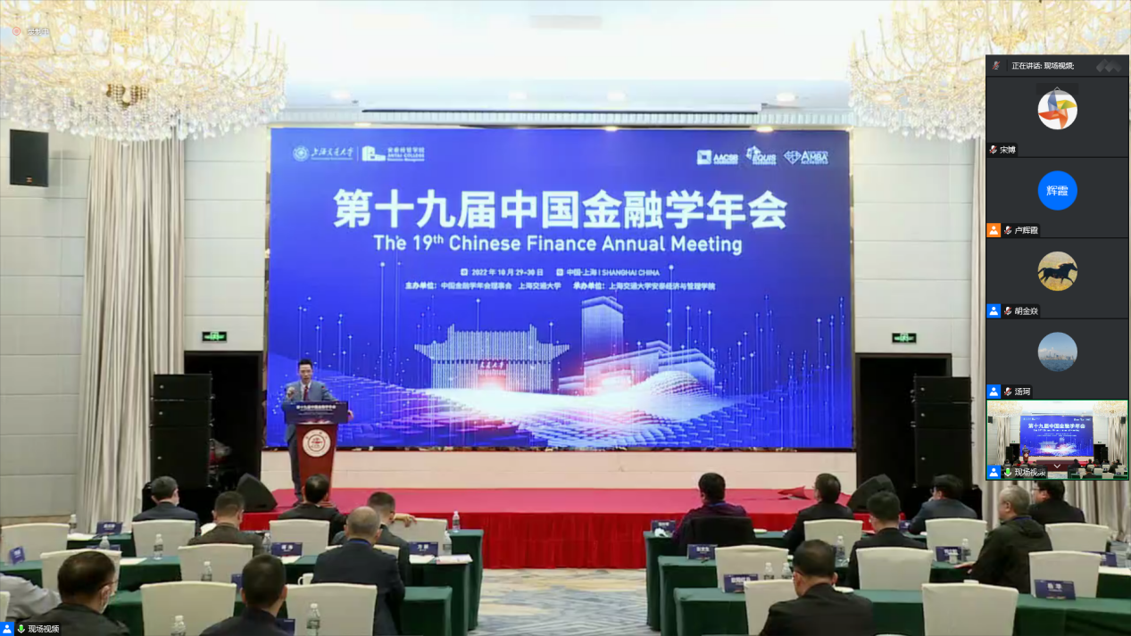 2022年10月29日至30日,第十九届中国金融学年会在上海交通大学安泰经济与管理学院举行。受近期疫情反复和防疫政策变化的影响,外地专家改为线上参会。金融学系奚宾、宋博、吴成浩等部分老师和研究生在线参加了此次会议。