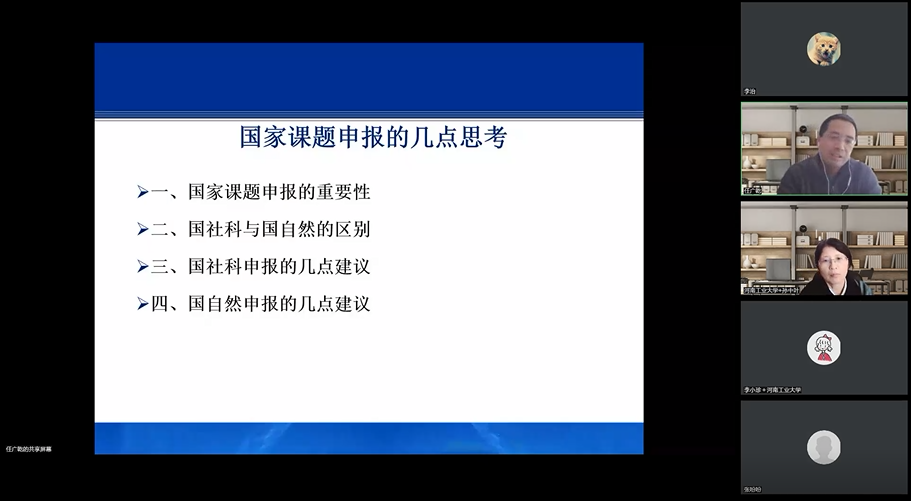 任广乾从国家课题申报的重要性、国社科与国自然的区别、国社科申报的几点建议和国自然申报的几点建议等四方面出发,结合自身申报课题以及通讯评审的实例与大家作了深入的经验分享,重点介绍了国家课题的申报技巧和填写规范,鼓励青年教师多去申报青年课题,深入浅出地讲解国家级课题申报的注意事项,并在报告结束后进行答疑。孙中叶在总结发言中指出,任教授以严密的逻辑和精炼的语言为老师们贡献了一场精彩的报告,丰富的内容和精粹的阐释使大家受益良多,希望老师们会后认真吸收消化报告内容,积极申报国家级课题,扎扎实实做好课题研究。