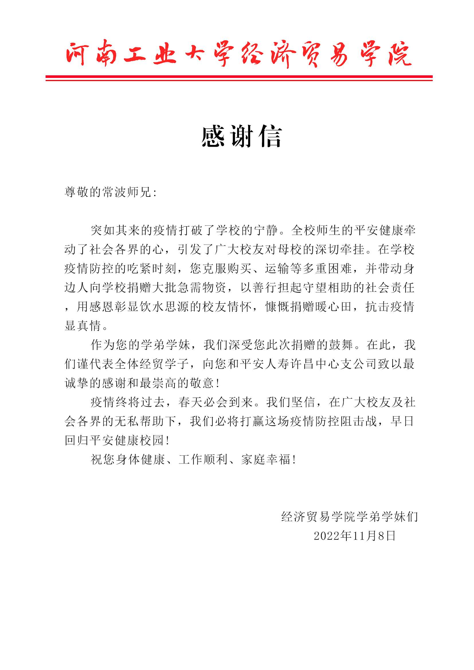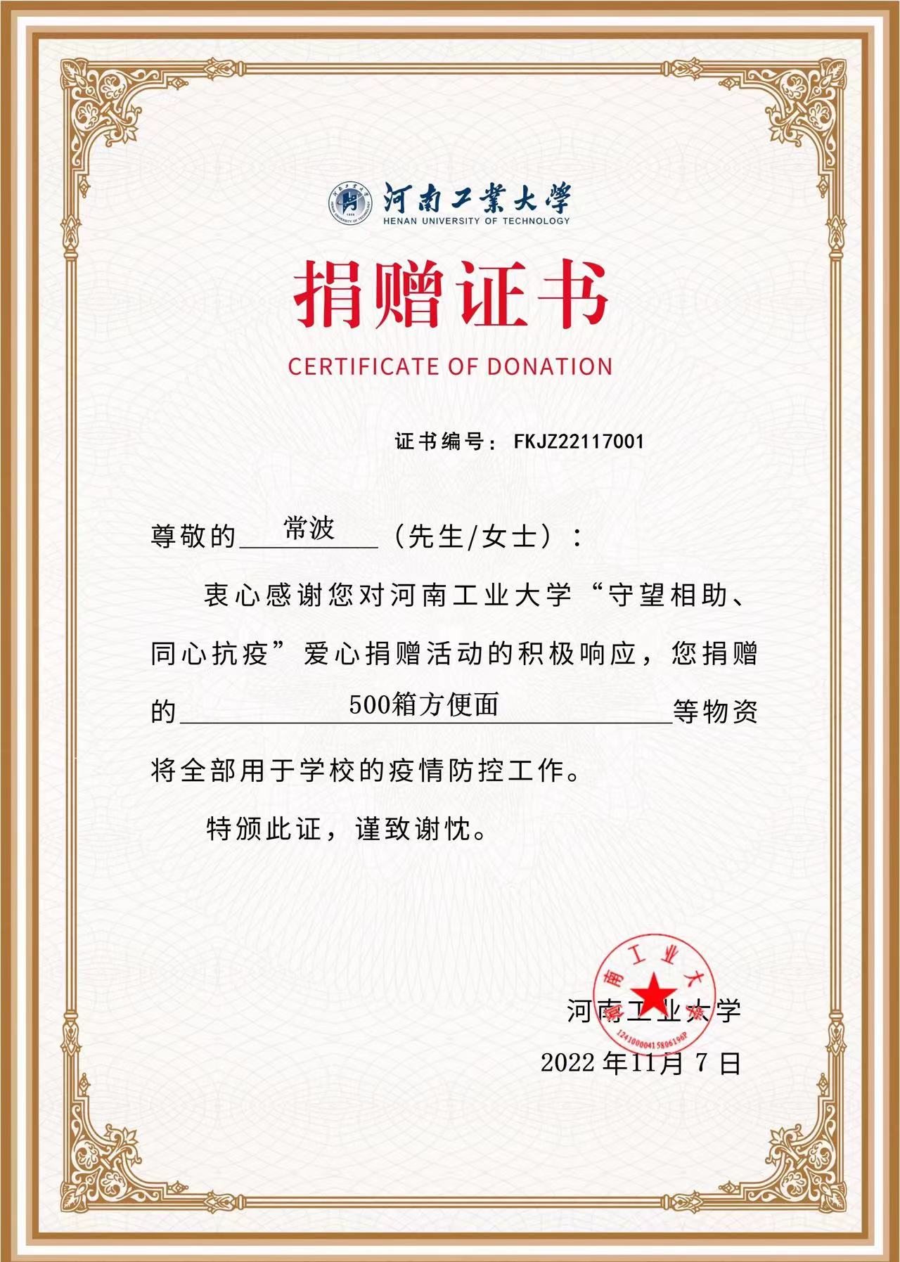 病毒无情,人间有爱,莲花街校区因疫情防控实行封闭管理。常波情系母校,急母校之所急,在得知学校对食品物资需求量比较大后,克服购买、运输等多重困难,个人筹备方便面500箱,同时发动公司同事张新总监(前程团队)为学校捐赠方便面280箱;在他的带动下小学三年级的儿子常有为同学也用零花钱捐赠方便面20箱。更让人感动的是,当常波校友在许昌中原物流港采购物资时,一位爱心大姐了解到物资是用于助力91吃瓜