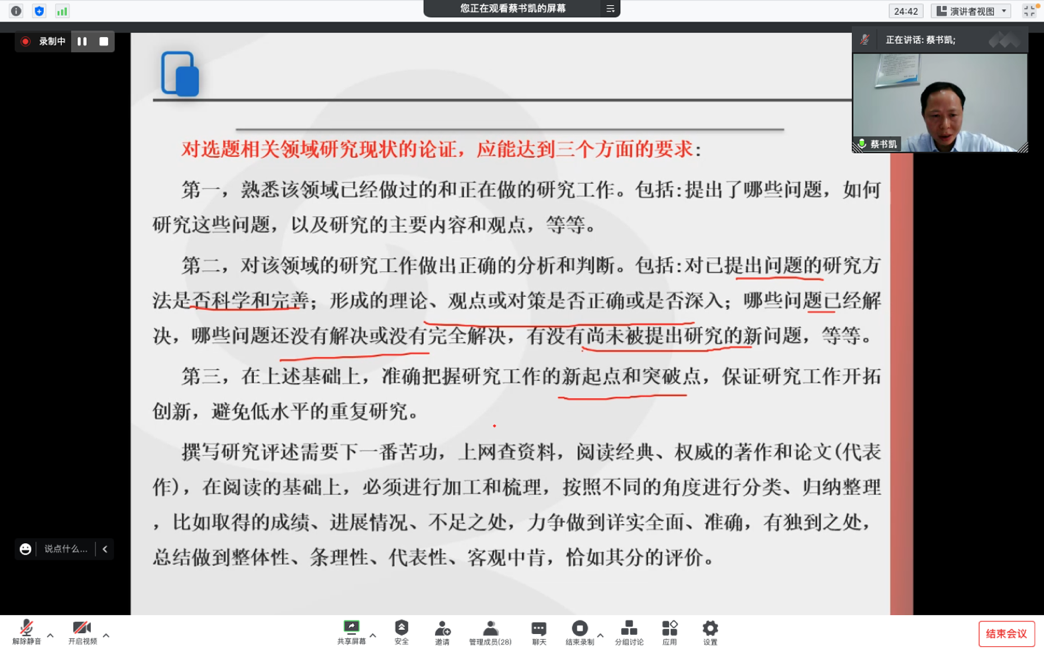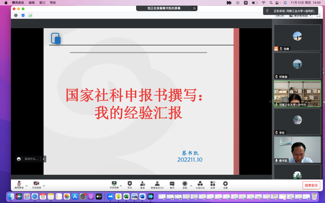 蔡书凯教授就国家社科基金项目申报经验与大家进行了分享,从选题到标书撰写的每一个板块,再到申报方法及注意事项都做了详细的讲解。李云蕾等老师报告了项目选题和申报进展情况。最后孙中叶院长和团队负责人邓俊淼教授做了会议总结,并对下一阶段的申报工作及会议安排做了部署。