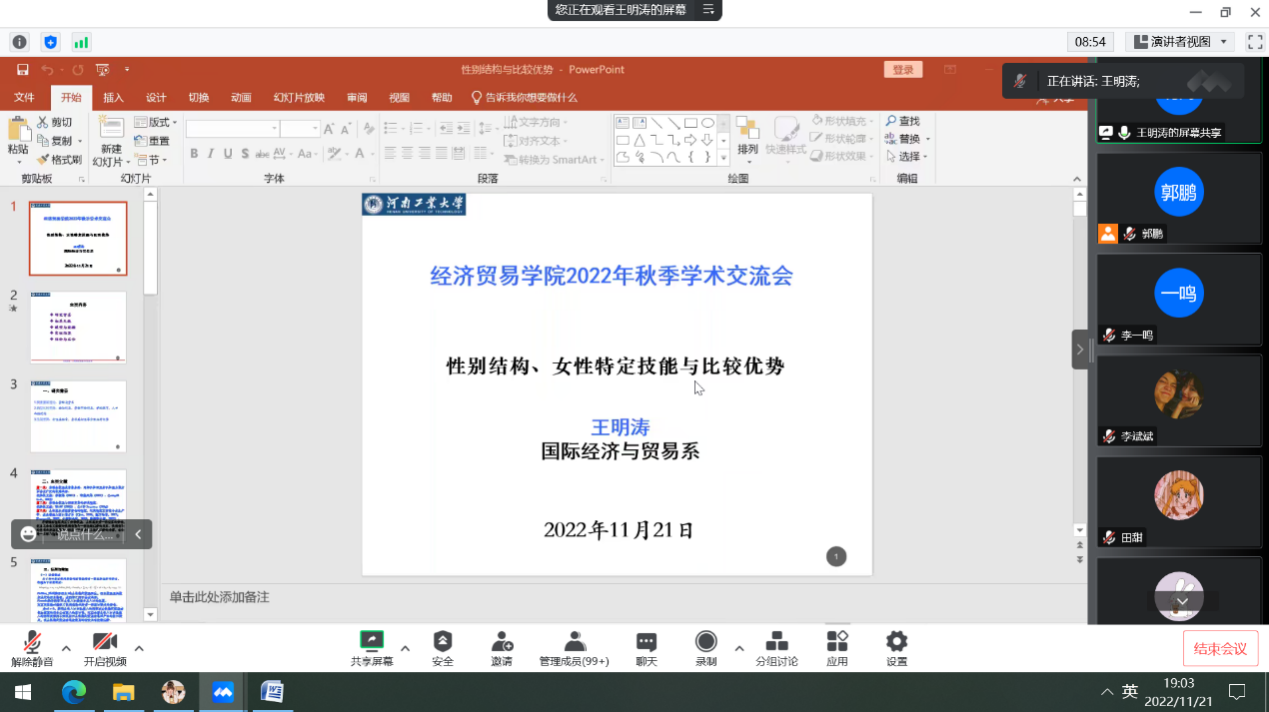 本期论坛的主讲人是毕业于南京大学的国际贸易系青年教师王明涛博士,报告题目为《性别结构、女性特定技能与比较优势》,该论文主要讲述了人口性别结构差异如何通过特定技能影响一国贸易模式,其结果显示女性人口占比较大的国家在女性特定技能密集度较高的行业具有更多的出口,表明性别结构的跨国差异是国际贸易比较优势的来源。而分样本研究表明,女性特定技能对OECD国家贸易流量的影响较大,对非OECD国家影响较小。