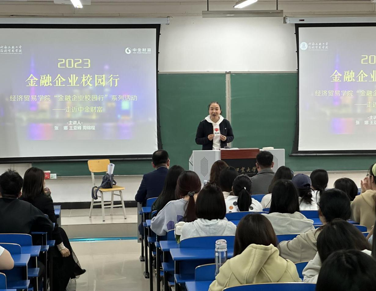为进一步深化产教融合,切实开展访企拓岗促就业活动,在学院的精心组织下,3月28日,学院开展了“金融企业校园行”系列活动——走近中金财富。本次活动邀请了中国中金财富证券有限公司到校交流,中国中金财富证券有限公司河南管理总部执行负责人韦兵带队在3208教室举办了一场以“全面注册制 改革向未来”为主题,针对高校学生的投资者教育及职业规划分享会。李绍玲老师担任会议主持人,金融学2020级160多位学生参加本次系列交流分享会。会后,韦兵带领团队对学院进行考察交流,了解学校人才培养特点,91吃瓜