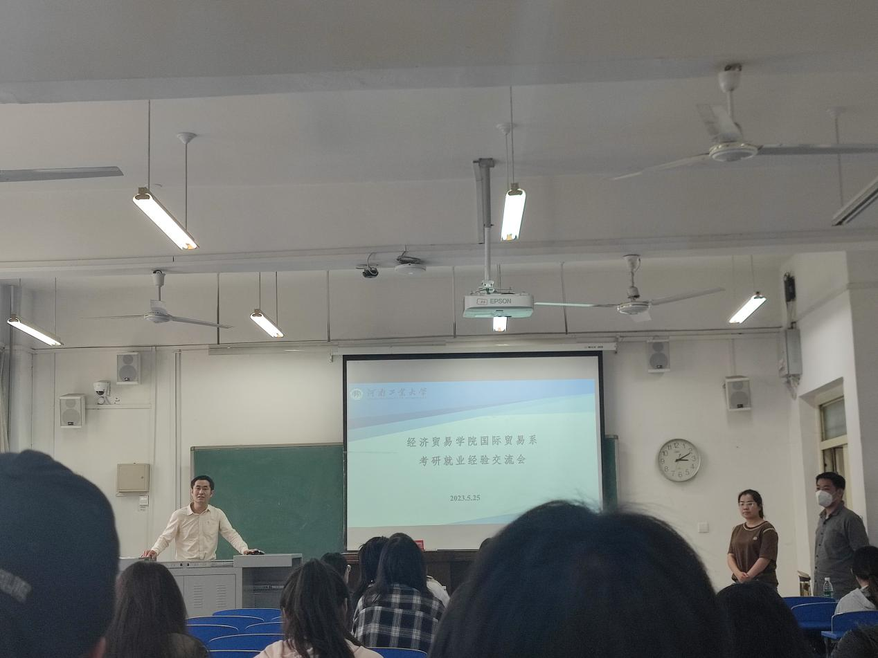 为帮助学生树立正确的就业观和择业观,尽快明确考研目标,帮助学生树立信心,2023年5月25日,国际贸易系在3310教室开展考研就业经验交流会。国际贸易系支部书记鲁慧鑫、20级班主任及20级国际经济与贸易专业学生参加。此次会议邀请到袁晓婷、冯墨轩、王梦佳和郭冠廷四位同学为大家做考研就业经验分享,会议由鲁慧鑫老师主持。