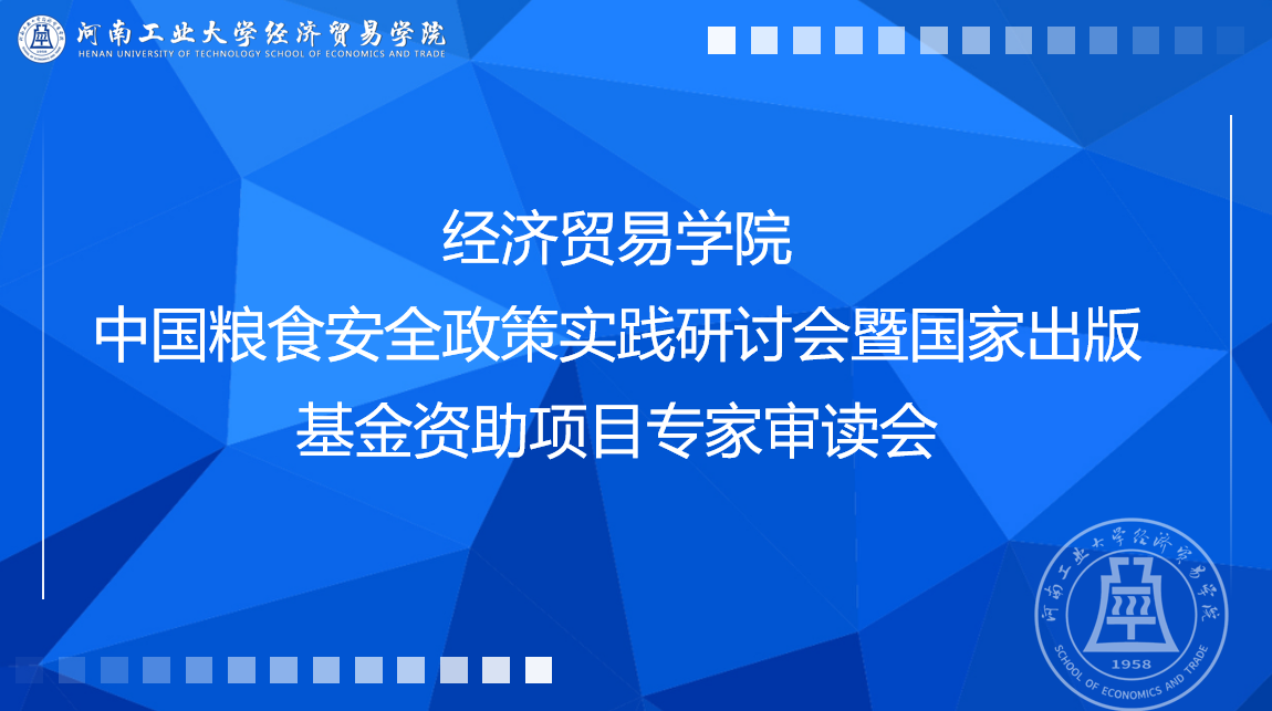 主办,河南省特色智库粮食经济研究中心、河南省现代农业产业技术经济评价体系协办的“中国粮食安全政策实践研讨会暨国家出版基金资助项目专家审读会”在我校举行。会议由河南省社会科学界联合会副主席苗树群主持,中国社会科学院武舜臣、中国农业出版社王佳欣和河南省现代农业产业技术经济评价体系赵翠萍等学者参与。
