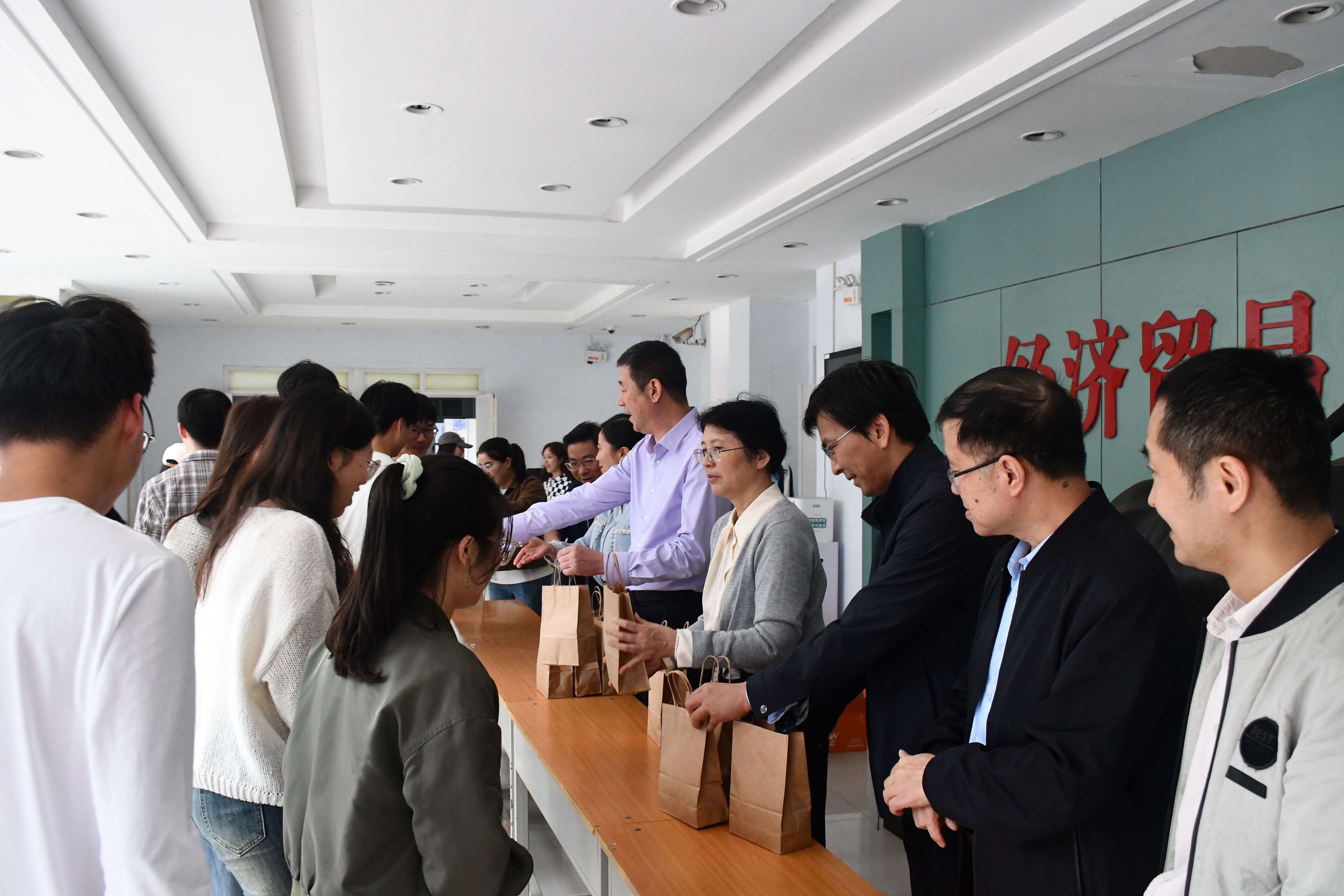 在博识楼西门大厅开展中秋慰问活动。学院党委书记李刚、院长孙中叶、副书记岳鹏珍、副院长朱坤林、汪来喜、各系室负责人以及辅导员参加了本次活动,为留校生送去节日礼品和祝福。