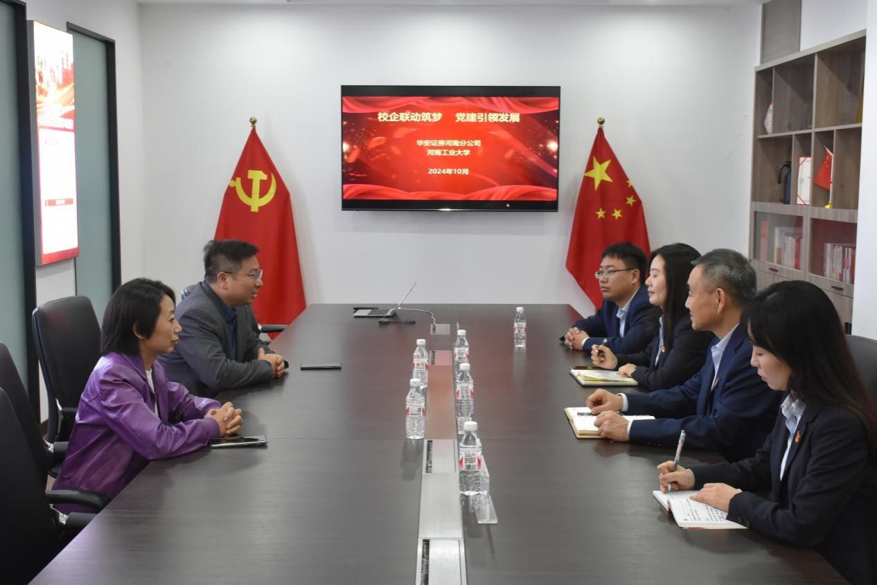 10月22日下午,经贸学院金融系党支部书记刘变叶、实验室主任吴成浩等师生一行前往学院产学研实践教学基地华安证券河南分公司进行实地调研。华安证券河南分公司第二党支部支部书记、商都路营业部总经理许鲁南,党总支组织委员桑晓青,第二支部组宣委员李静茹、商都路营业部团队主管党晓占一行热情接待并参加了会议。