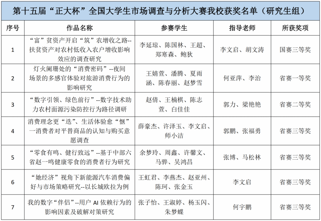 此次比赛成绩的取得,是学院注重研究生实践能力和创新精神培养的充分体现。学科竞赛作为提升研究生综合素质的重要途径,各参赛队伍的作品在指导老师的悉心指导下,无论是选题的创新性、调查的科学性、分析的深入性以及结果的实用性等方面均严谨务实;其次,从调查方案的设计,到数据的收集与分析,以及作品最终的完善、提交和评选,每一个环节都体现了师生们的严谨态度和创新能力,展示了扎实的专业知识和出色的综合素养。