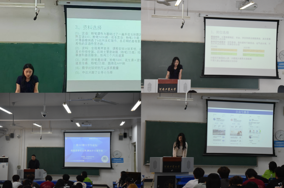 会议伊始,王秋瑾简要介绍了此次论坛的主讲嘉宾,希望同学们珍惜此次交流机会,能从身边榜样的经历中汲取力量,明确发展方向,不断提升自我。随后,四位优秀学生代表依次分享了各自的经验与感悟。张钰婷结合自身科研实践经历,详细介绍了论文发表与学科竞赛获奖的历程,详细介绍了准备保研的时间线、推免政策和材料准备,并结合自己复试的经历向大家分享了在面试时候需要注意的问题。王帅羽通过回顾担任学生干部的经历,对考研备考期间的择校选择、学习计划、心态调整和复试备考策略等多个方面等方面进行分享。刘乐从如何搜集调剂信息、调剂过程和复试准备等方面详细分享了自身调剂历程。杨丽娜结合自身的考试经历,分别从招考信息获取、报考要求、岗位选择、行测、申论的备考和面试的准备提供了许多实用性意见和建议。
