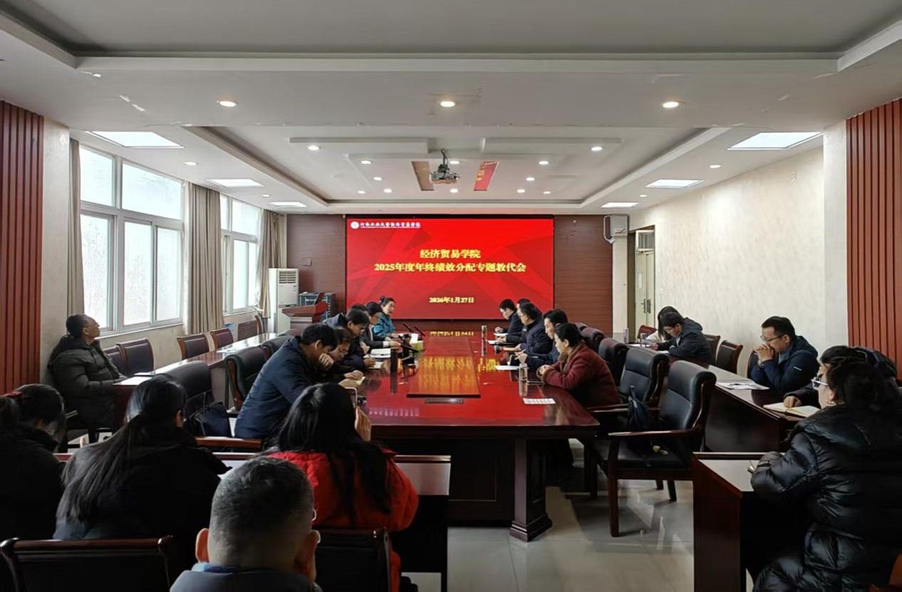 在博识楼3501会议室召开2025年度年终绩效分配专题教代会,学院领导班子成员、教职工代表参会。会议由院党委副书记、工会主席岳鹏珍主持。