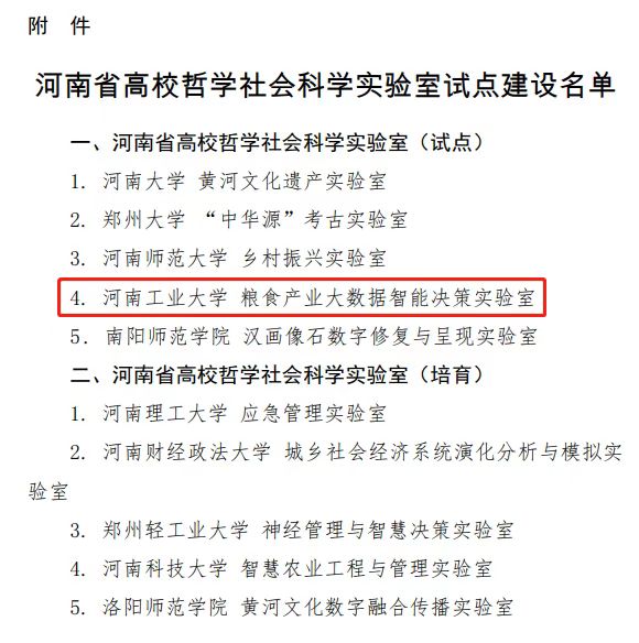 建设的粮食产业大数据智能决策实验室获批河南省首批高校哲学社会科学实验室。