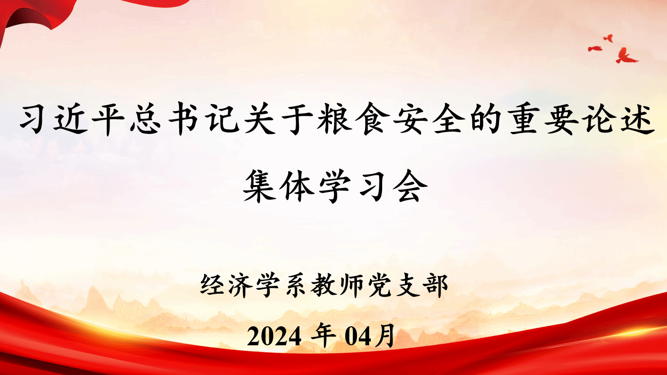 为深入学习贯彻习近平新时代中国特色社会主义思想,全面贯彻落实习近平关于国家粮食安全重要论述精神,4月9日下午,经济学系教师党支部在3506教研室召开主题党日活动,支部宣传委员李文华老师做题为“习近平关于国家粮食安全重要论述”的党课学习。经济学系全体党员参加,会议由系党支部书记何宇鹏主持。