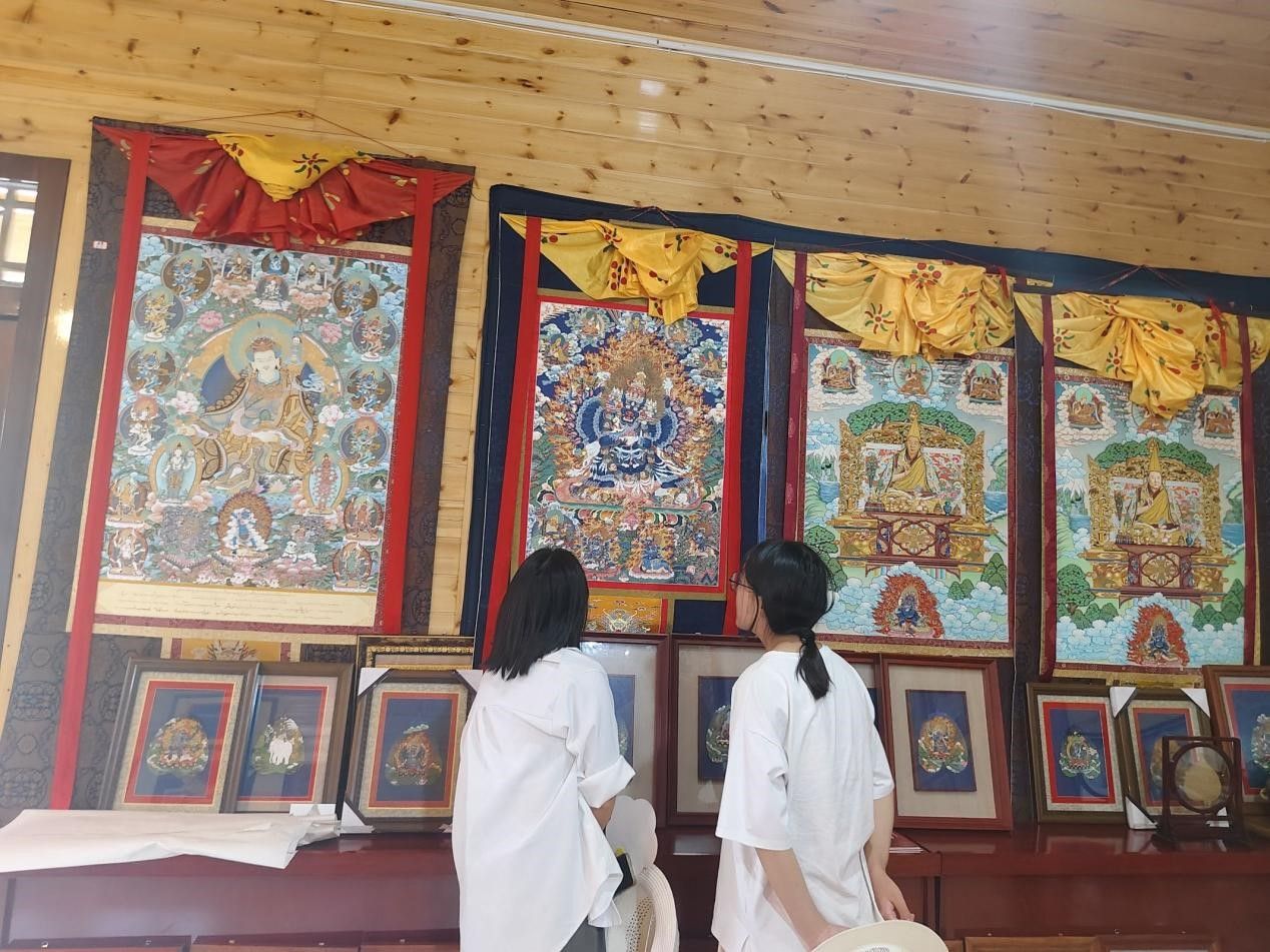 7月18日上午,在安达其哈唐卡展馆,实践团队成员们仔细观察唐卡的细腻笔触和丰富色彩,深入了解了这一非遗民族艺术的独特魅力。宗喀唐卡传承人就唐卡的历史渊源和技艺传承向成员们进行了介绍。