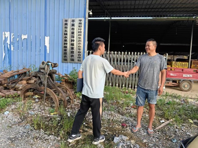 图为团队队员和果园园主黄华星见面