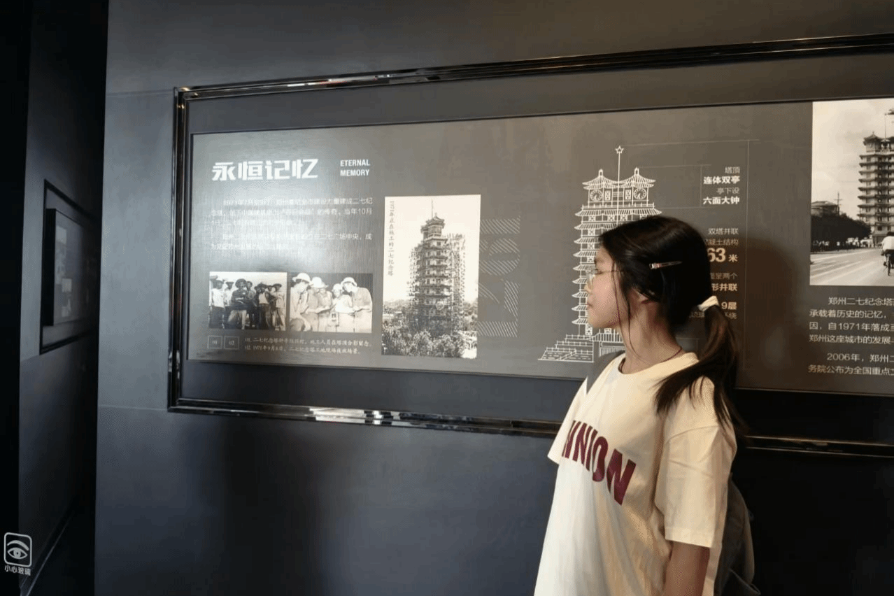 在“二七精神”专题展板前,讲解员详细介绍了“团结奋斗、不怕牺牲、追求真理、自强不息”的精神内核。在调研过程中,团队带着相机在塔内塔外记录每一个触动瞬间,采访不同年龄层的市民,尤其是青少年。通过与他们的对话,了解他们对二七塔的认知以及对其未来发展的期望。团队成员认真记录每一位受访者的观点,捕捉二七塔在不同角度下不同的轮廓,让“红色传承”的火种通过青春视角传递出去。
