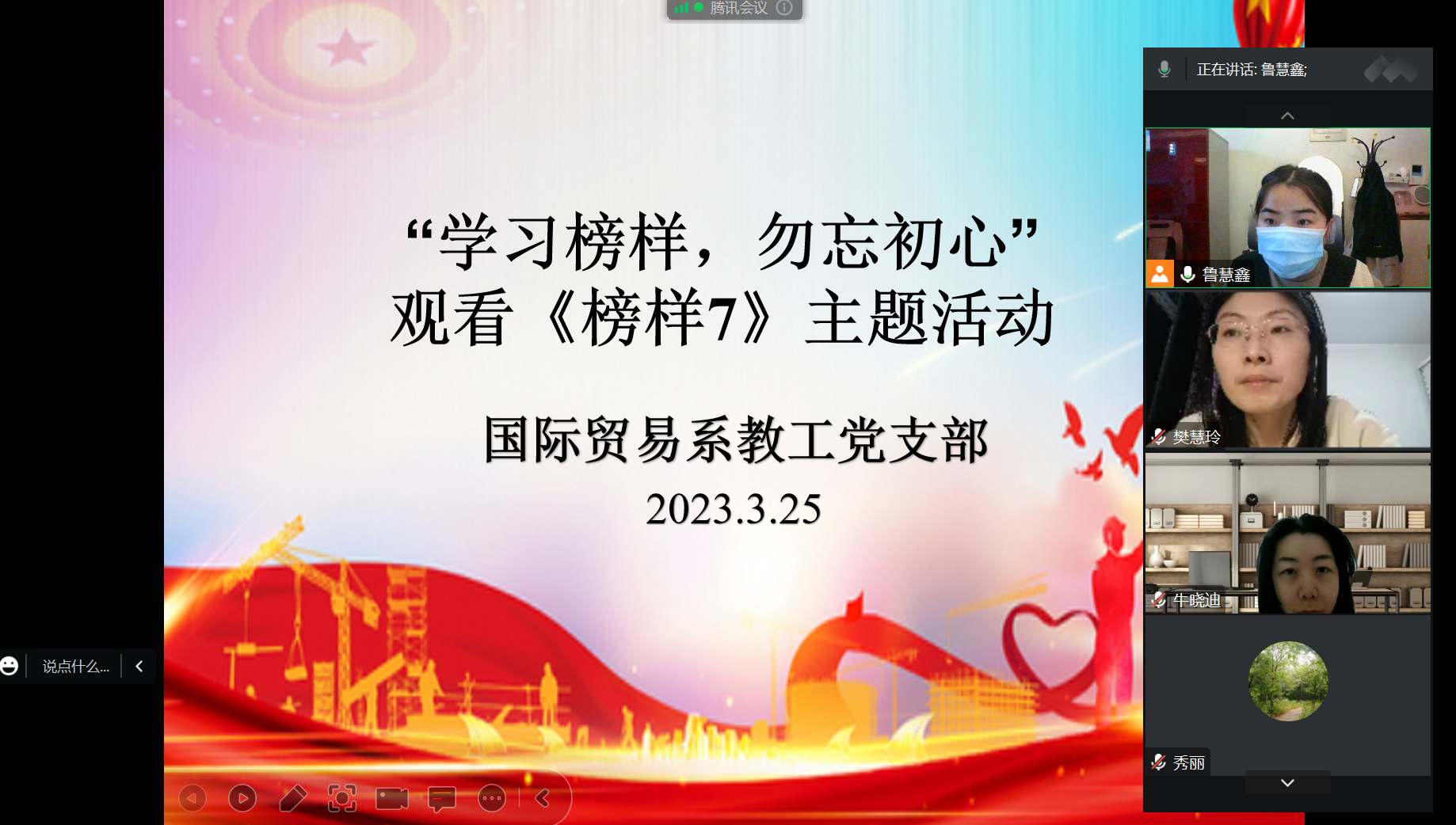 为深入学习贯彻习近平新时代中国特色社会主义思想和党的二十大精神,充分发挥先进典型示范引领作用,大力宣传党的二十大代表的先进事迹,教育引导广大党员学习榜样、争当先进。3月25日晚,国际贸易系教工党支部组织全体党员观看《榜样7》,会议由支部书记鲁慧鑫主持。