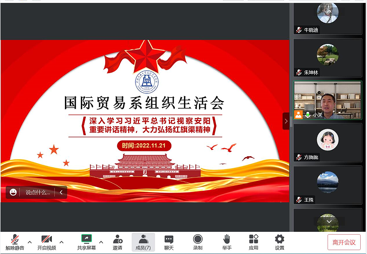 为深入学习贯彻党的二十大精神和习近平总书记视察河南安阳重要讲话精神,推动院系工作不断创造新的业绩,2022年11月21日晚上,国际贸易系党支部召开以“深入学习习近平总书记视察安阳重要讲话精神,大力弘扬红旗渠精神”为主题的专题组织生活会,党支部全体党员参加了此次会议。
