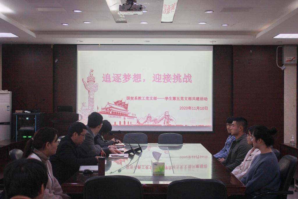 于11月10日下午在3501会议室开展国贸系教工党支部和学生第五党支部共建活动。院党委副书记王鹏,国贸系主任马松林,系党支部负责老师王秋瑾,部分教工,国贸系党员、预备党员、发展对象和入党积极分子参加了此次活动。活动由国贸系党支部书记关浩杰主持。
