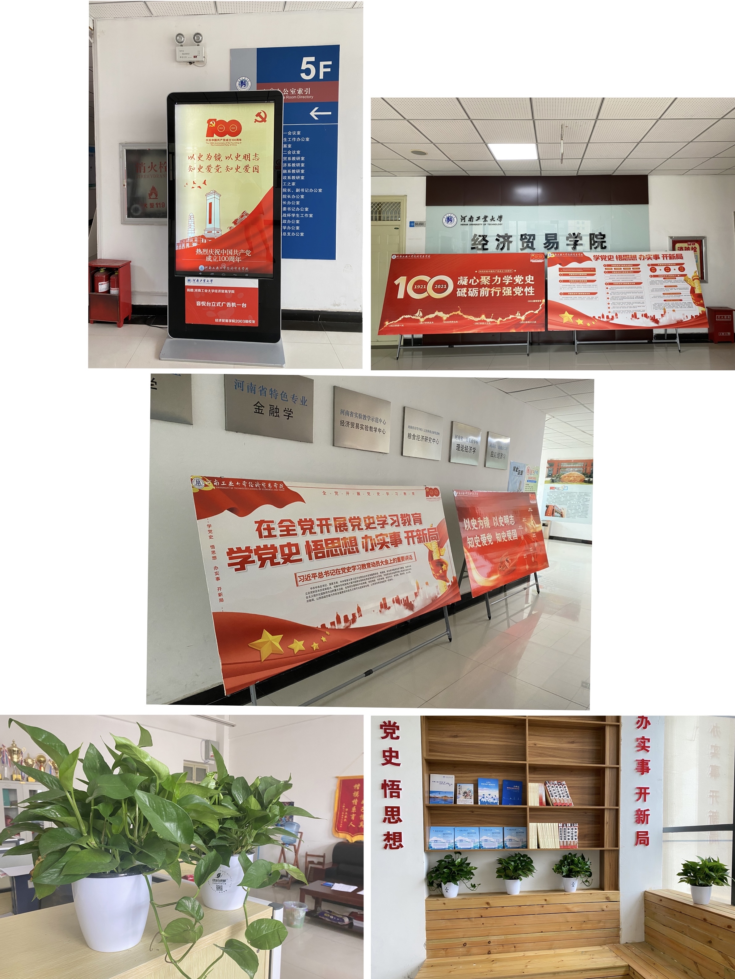 营造氛围,喜迎百年。学院制作了党史学习教育主题展板摆放在学院显著位置,利用学院的LED和电子宣传屏,宣传党史学习教育标语,展示党史学习教育海报,营造出浓厚的党史学习氛围。同时,学院还打造“易创家”党建读书角,供学院师生共同学习领悟党史精神,使学院上下形成人人学党史、人人知党史的浓厚学习氛围。