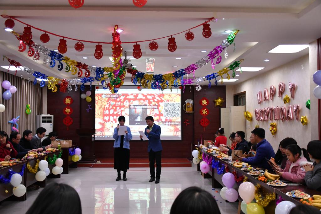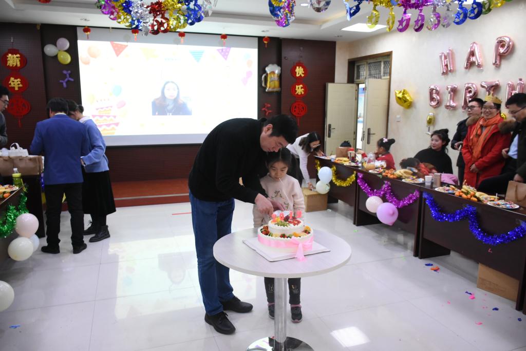 联欢会由三个部分组成,首先经贸学院全体教职工观看了合唱比赛幕后视频,院党委副书记王鹏为此次联欢会致辞,以一副自创的对联表达了对经贸全体教工的新年祝福。接着学院为“逢五逢十”的11名老师举办了集体生日会。生日会上,院党委书记李刚、副院长李文启为过生日的教职工送上了大礼包,寿星们头戴生日帽,一起许愿并吹灭了生日蜡烛。最后进入全体教工大联欢环节,通过一轮又一轮的投屏游戏“数钞票”、“瑞鼠迎春”活跃了全场的气氛。游戏“抢凳子”,“小鸡下蛋”和“抢洗洁精”中,老师们进行了速度与反应力的比拼。“心有灵犀”考验了老师们的默契与配合,奖品伴随游戏一轮一轮地送出,更有一场又一场的“红包雨”将现场气氛推向高潮。