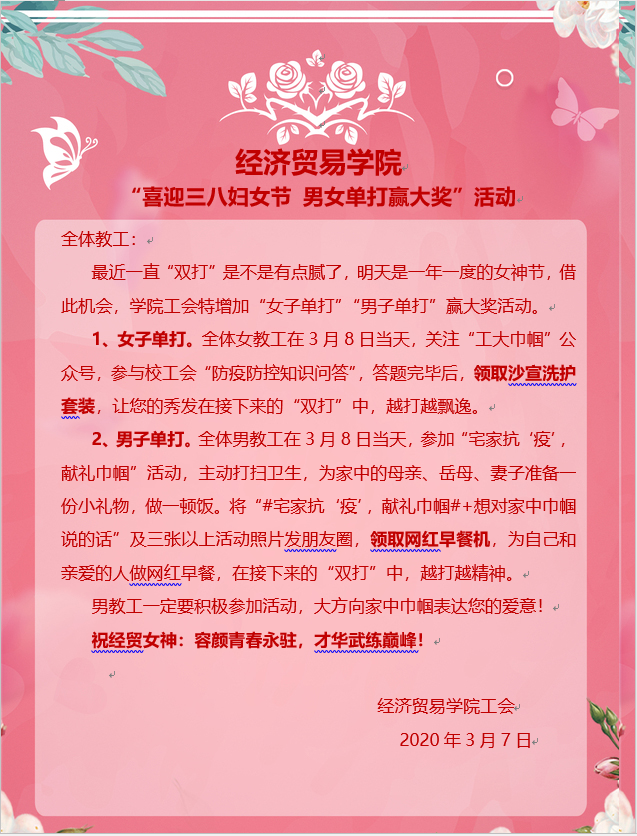 此次活动共分为两项。老师们每天在学院群完成省教育系统健康填报和学校完美校园健康日报后,不约而同地都回复“双打已完成”,为活跃气氛,学院工会特设了“女子单打”和“男子单打”两个项目。女教工在3月8日当天,关注“工大巾帼”公众号,参与校工会“防疫防控知识问答”,答题完毕,完成“女子单打”项目后,领取宣洗护套装,希望女教工们每天秀发飘逸、神清气爽。男教工在3月8日当天,参加“宅家抗‘疫’,献礼巾帼”主题活动,主动打扫卫生,为家中的母亲、岳母、妻子准备一份小礼物,做一顿饭。将“#宅家抗疫,献礼巾帼#”作为话题加上想对家中巾帼说的话和三张以上活动照片发朋友圈,完成“男子单打”项目,领取网红早餐机,希望男教工们今后的每一天都能为家人做美味的早餐。