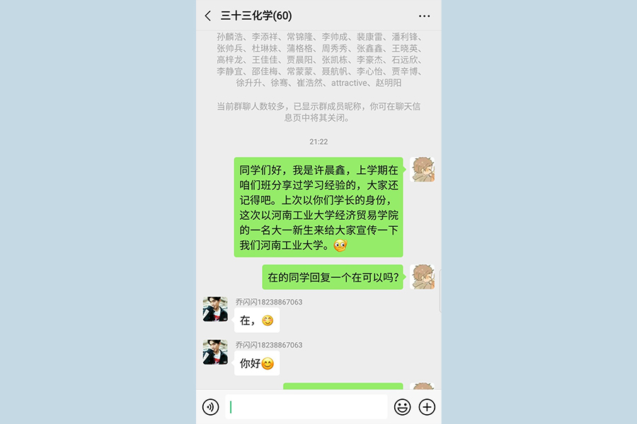 学院指导宣讲成员在微信群、QQ分享屏幕等方式为百余名高三学子介绍了学校的办学历史、学科特色、近年招生政策等,切实提高学校在洛阳市、驻马店市的知名度、影响力。学院学生高明哲、许晨鑫利用线上平台,围绕《高三学子如何进行自我管理》《时间管理方法经验》《高考备战日记》等话题助力高三学子在高考中取得佳绩,并鼓励高三学子在疫情期间做到“停课不停学”,分享了自己的高考的备考心得和考试经验。