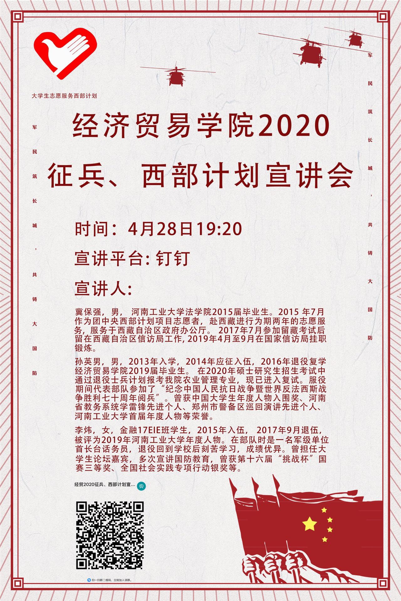 召开线上2020年大学生应征入伍暨西部计划宣讲会。本次会议邀请了留藏优秀志愿者、法学院2015届毕业生冀保强介绍西部计划的相关情况,91吃瓜