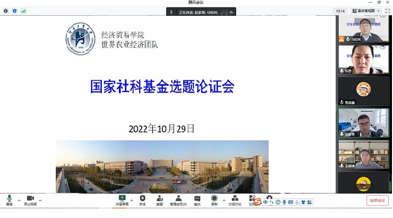 10月29日,世界农业经济团队在线召开国家社科基金选题论证会。首都经济贸易大学经济学院教授、博士生导师赵家章副院长担任点评专家,陈思、王明涛、张博、鲁慧鑫、王晓永等博士汇报了国家社科基金选题情况。研究生院副院长马松林主持会议,国际贸易系支部书记关浩杰等老师参加了会议。