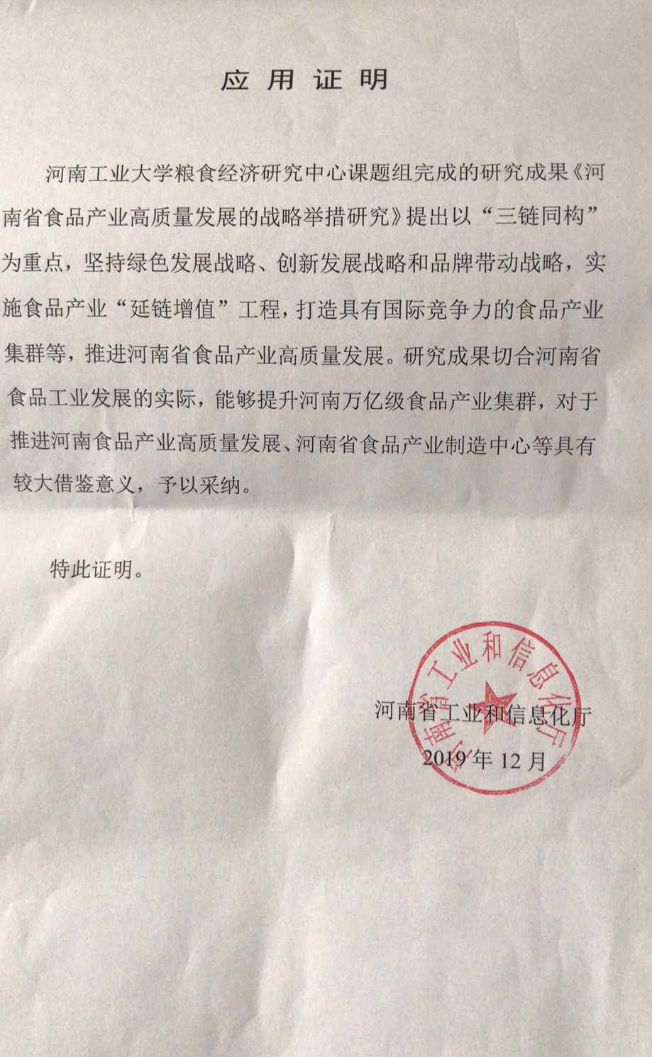 应用证明——河南省食品产业高质量发展额战略举措研究
